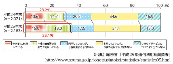 クラウドサービスを利用している企業の割合は平成24年末の28.2%から33.1%に上昇。【図1】